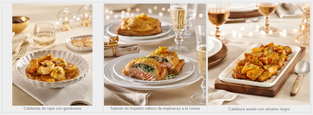 Esta Navidad, entre las novedades del catálogo de platos preparados destacan la crema de carabineros; la carrillera ibérica con salsa de colmenillas y foie; el solomillo de cerdo ibérico Wellington con salsa de Pedro Ximénez y foie; el pavo relleno asado con salsa de colmenillas y foie; la caldereta de rape con gambones; el salmón en hojaldre relleno de espinacas a la crema; la calabaza asada con sésamo negro; la salsa de colmenillas y foie; y en los postres el pionono de mousse de naranja y crema de mandarina tostada; y la torrija de roscón de Reyes con nata.