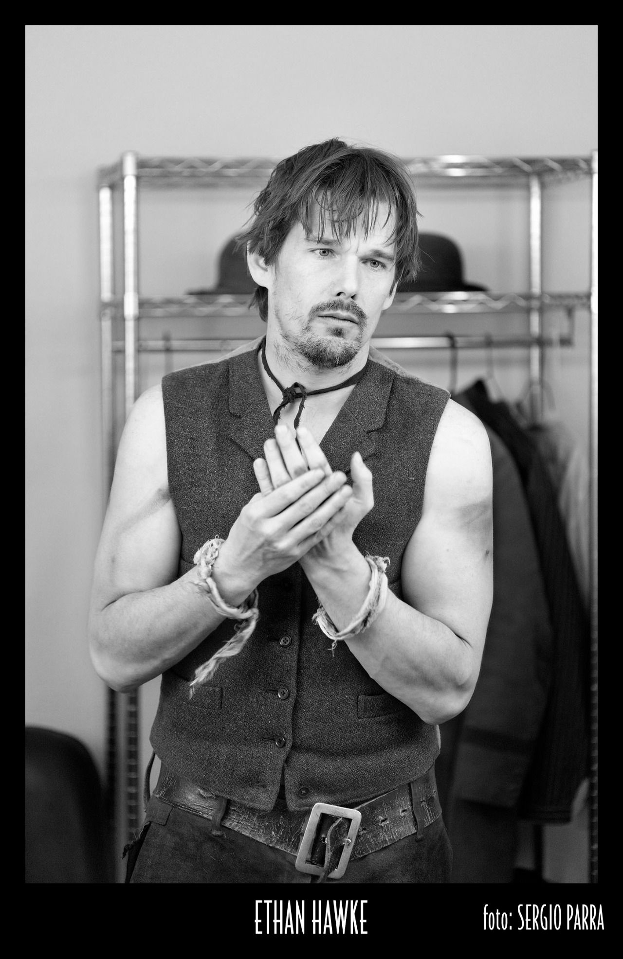 Y –ahora sí-, no me resisto a preguntar a Sergio por la primera parte de la exposición de Camerinos, que fue en Mérida, hubo una cierta polémica con una foto que Sergio le hizo a Asier Etxeandía: “se la hice siete años antes de la exposición. Hacía Infierno, un montaje de Tomaz Pandur, en el que lo maquillaban como el Cristo de Velázquez. Él tenía la postal con la pintura de Velázquez en su camerino y estaba totalmente desnudo. La única premisa que me puso es que no quería que se le viesen los genitales. Le dije que bajaría el tiro de cámara y que solo se le vería de cintura para arriba, pero a él mismo se le ocurrió de forma espontánea, quitarse una pinza que llevaba en la cabeza, coger con ella la postal y enganchársela en el vello púbico para taparse. Hubo mucha polémica con eso, pero ni él lo pensó, ni yo tampoco. El escándalo, desde luego, está más en la mirada que en la imagen. Yo la seleccioné para la exposición porque me parecía simplemente una foto muy bonita y no pensé nunca en las consecuencias… Había otros desnudos (Verónica Echegui, Tamara Rojo…), con ellas no pasó nada. Sólo fue por el tema de la iconografía religiosa, que siempre desata pasiones. Reconozco que pequé de ingenuo”