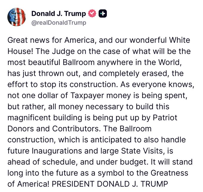 Fiel a su estilo, Trump utilizó su red social 'Truth Social' para cargar contra la decisión judicial y contra la organización demandante. El presidente calificó a los miembros de la NTHP de "grupo de extremistas de izquierda desquiciados" y defendió con vehemencia la construcción. Según Trump, el salón de baile se estaba levantando por debajo del presupuesto inicial y se encontraba adelantado respecto al cronograma previsto, asegurando que se convertiría en el edificio más hermoso de su clase en todo el mundo.