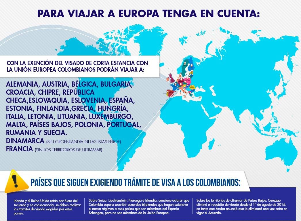 La medida servirá para los desplazamientos a cualquiera de los países de la Unión Europea, con la excepción de Reino Unido e Irlanda, y no servirá para visitar Noruega, Suiza, Islandia y Liechtenstein. Bulgaria, Chipre, Croacia y Rumania sí entrarían en el bloque de países de la UE que dejarán de exigir el visado, a pesar de no ser aún parte del acuerdo Schengen, si bien la estancia en esos cuatro países se calculará individualmente y no contará para el tope máximo de la estancia, tal y como informan fuente de la embajada colombiana en Madrid.