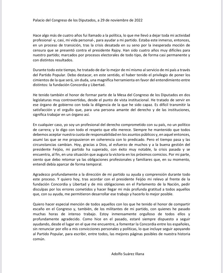 "Hoy, gracias a Dios, al esfuerzo de muchos y a la buena gestión del presidente Feijóo, mi partido ha superado, con éxito muy notable, la crisis pasada y se encuentra, al fin, en una situación que augura la victoria en los próximos comicios”, ha señalado en una carta pública.