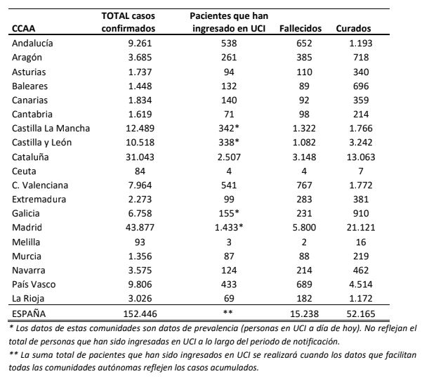 El último balance del Ministerio de Sanidad con los últimos datos de la pandemia de coronavirus arrojan un total de 15.238 fallecidos, con 152.446 contagiados confirmados con test y 52.165 curados dados de alta médica.