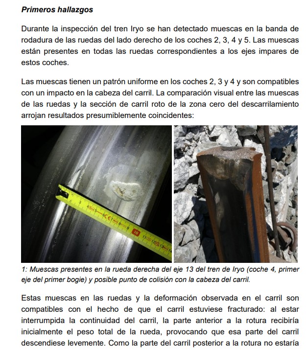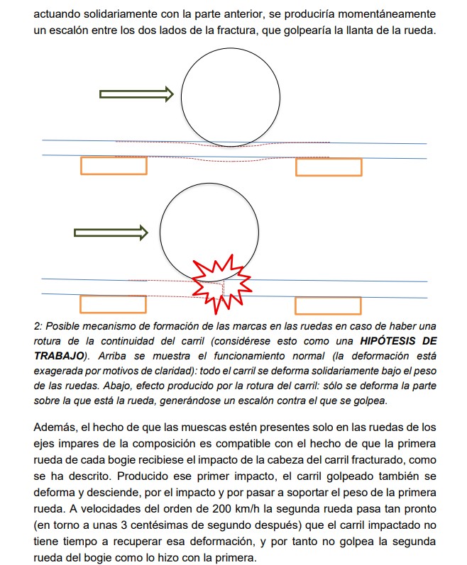 "Estas muescas en las ruedas y la deformación observada en el carril son compatibles con el hecho de que el carril estuviese fracturado", han remarcado.