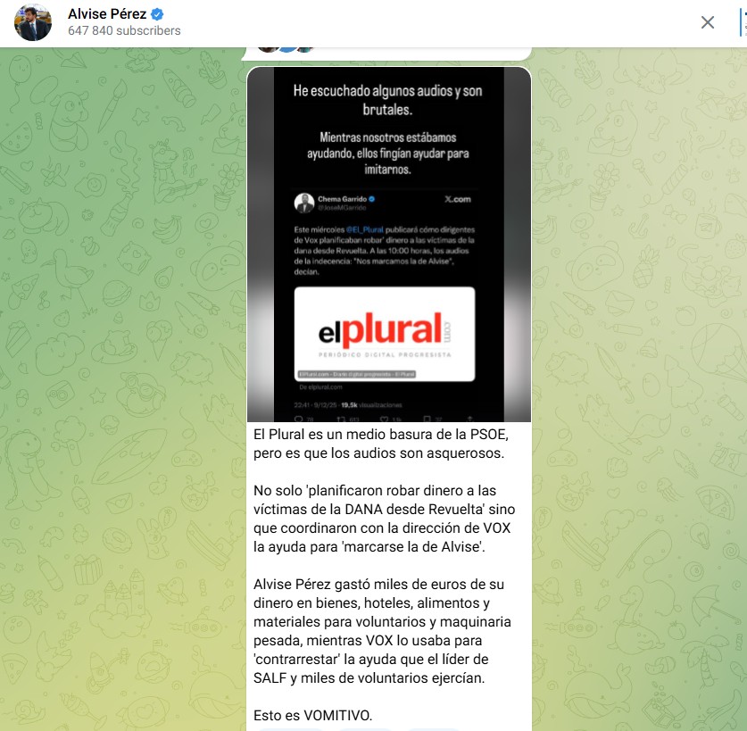"Y te haces una puta foto ahí con los viejos de la DANA y arreglado" y "Así ya no hay delito y nos marcamos la de Alvise", en referencia a las imágenes del eurodiputado durante la crisis, pues fue un rostro habitual en la zona.