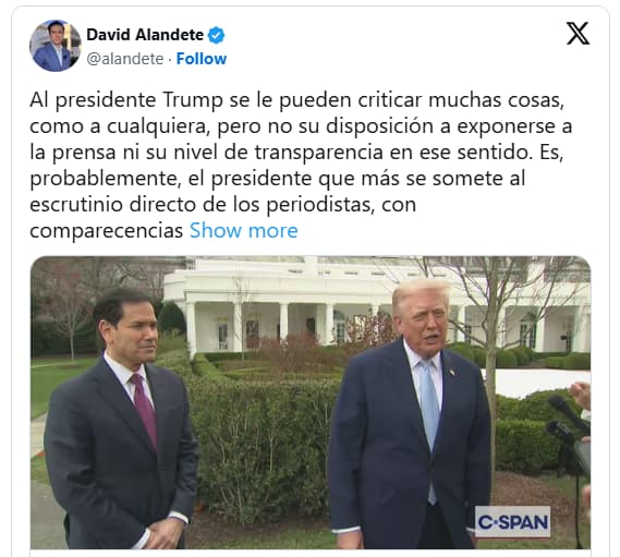 Además, alabó al presidente de EEUU por su trato hacia la prensa: "Al presidente Trump se le pueden criticar muchas cosas, como a cualquiera, pero no su disposición a exponerse a la prensa ni su nivel de transparencia en ese sentido". Añadió que Trump es "el presidente que más se somete al escrutinio directo de los periodistas, con comparecencias frecuentes y sin filtros", pero sin comentar las amenazas cometidas en los últimos meses.