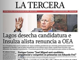 Esta mañana la noticia en portada fueron las reacciones de los distintos sectores políticos tras hacerse pública la renuncia del ex Mandatario Ricardo Lagos a la carrera presidencial. Los medios profundizan en el impacto producido al interior de la coalición de gobierno y en las respuestas de la oposición. Mientras La Nación destaca el paso al costado de Lagos, El Mercurio se concentra en las diferencias suscitadas al interior del PPD respecto de apoyar al DC Eduardo Frei o al PS José Miguel Insulza. La Tercera, en cambio, resalta la inminente renuncia de Insulza a la Secretaría General de la OEA y los dichos del postulante PS a la primera magistratura: “Mi nombre estará siempre disponible para una candidatura que sea factor de unidad y reciba respaldo suficiente dentro de la Concertación".