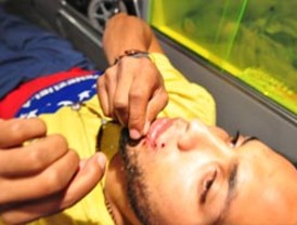Antes de ingresar en la ambulancia donde se selló los labios, el estudiante Vilca Fernández llamó "dictador" a Chávez y sostuvo que no ha respondido sino con "la criminalización de la protesta". El "dictador de (la casa presidencial de) Miraflores intenta nuevamente asesinar a la juventud venezolana", dijo y agregó que se cose la boca "para levantar miles de voces en todo el país". Las autoridades gubernamentales "jamás sellarán nuestras ideas, jamás sellarán nuestro deseo de construir una patria, una universidad", declaró a los periodistas. Los jóvenes mantienen su protesta frente a la sede en Caracas del Programa de las Naciones Unidas para el Desarrollo (PNUD), aunque la representante de los huelguistas, Gabriela Arellano, sostuvo que "más de 600 estudiantes" respaldan a los huelguistas "en el Puente Internacional Simón Bolívar en la frontera de Táchira con Colombia". En respuesta a la huelga, universitarios seguidores de Chávez respondieron el jueves pasado con una multitudinaria marcha, encabezada por la ministra de Educación Superior, Yadira Córdova. "Hoy vemos cómo estudiantes de diferentes tendencias (...) incluso aquellos que pueden estar manipulados sirviendo a un plan de desestabilización, gozan de todos los derechos y pueden manifestar en todos los espacios", dijo entonces la ministra. Robert Serra, diputado oficialista y hasta el año pasado dirigente estudiantil chavista, denunció que esa y otras huelgas en contra de Chávez forman parte de un supuesto plan financiado "por tres banqueros venezolanos prófugos de la justicia". "No se acabarán estas huelgas. Si hoy mismo saldáramos las reivindicaciones universitarias y se levantara la huelga (en el PNUD), mañana habría otra, porque esto forma parte de una agenda para sacar a Chávez en 2012", a través de una estrategia de "golpe de Estado blando", sostuvo Serra en la marcha chavista. En horas de la tarde, el estudiantes Luis Magallanes ingresó a una ambulancia para colocarse dos puntos de sutura. Luis Magallanes, que lleva trece días en huelga de hambre frente a la sede del Programa de las Naciones Unidas para el Desarrollo (PNUD) tomó la decisión de colocarse dos puntos de sutura en su boca para dejar de ingerir líquidos y radicalizar su huelga de hambre ante el silencio del Gobierno respecto a las exigencias de los huelguistas. Informó que este miércoles a las 10 de la mañana el compañero Greys Fernández de la Universidad Pedagógica Experimental Libertador también radicalizará la protesta cosiéndose la boca. Desmintió las declaraciones de la Fiscal General de la República, Luisa Ortega Díaz, en las que criticó que un médico los ayudara a coserse la boca, y expresó que "el único médico presente era el doctor José Gregorio Hernández".  Lamentó que ni el presidente Hugo Chávez ni la ministra de Educación Universitaria, Yadira Córdova, hayan respondido a las exigencias de los estudiantes, por lo que les pidió que giren las instrucciones para cambiar la situación. Magallanes consideró que el Presidente "perdió los sueños de una patria libre", y es por eso que realizan la huelga de hambre. "Estamos sobreviviendo en una tierra donde asfixian la fábrica de sueño que son las universidades. Le pido a Jesús que este Gobierno escuche a los estudiantes y acepte el diálogo", añadió.   Foto: News Report