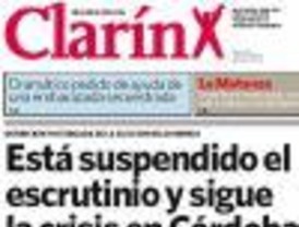 Arranco por Página 12, que es el que más a mano tengo y el que divide la portada entre los dos grandes protagonistas (algo parecido a la actitud del gobierno). Como rara vez ocurre en sus portadas esta división hace que sean dos los títulos de la misma. Por un lado la palabra de Schiaretti que dijo que “Lo que Juez busca es la intervención federal”, mientras que de Juez extrajo una fuerte declaración como que “Kirchner tiene que pedir que se abran las urnas”. Nos cuenta que “El Tribunal Superior de Córdoba ratificó a la jueza electoral recusada por Juez y hoy se retomará el escrutinio definitivo. Sin embargo, crece el enfrentamiento político y los dos candidatos buscan comprometer al gobierno nacional”.