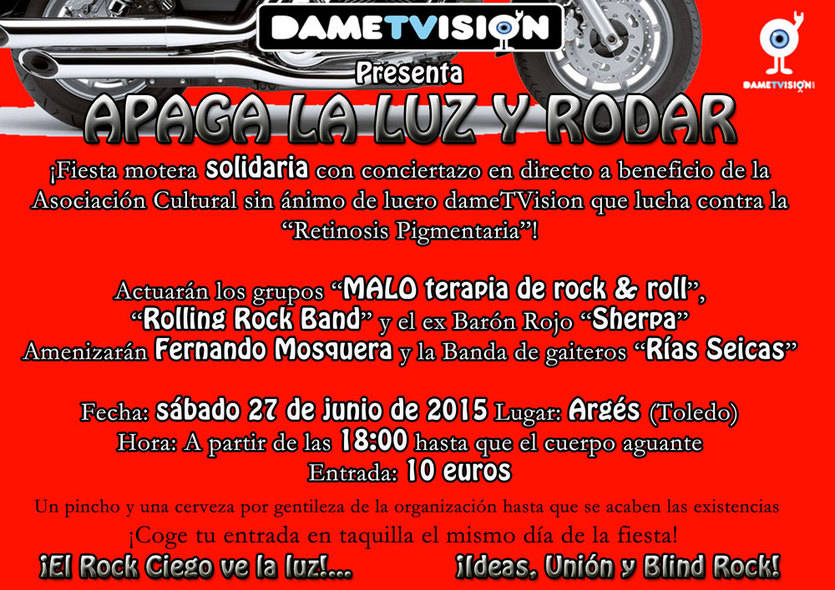 La localidad toledana de Argés acoge este sábado desde las 18 horas y hasta que el cuerpo aguante, la fiesta motera solidaria 'Apaga la luz y a rodar'. Se trata de un evento en beneficio de la Asociación Cultural sin ánimo de lucro 'Dame TVision' que preside el rockero donostiarra Ibón Casas.