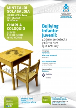 El Colegio Oficial de Enfermería de Gipuzkoa (COEGI) acogerá el jueves 1 de octubre, a partir de las 18,00 horas, en su sede (c/Maestro Santesteban 2. Amara), una nueva charla de su Espacio de Salud y Cuidados para los ciudadanos titulada: “Bullying Infato-Juvenil ¿Cómo se detecta y cómo hay que actuar?”. Con entrada libre hasta completar aforo, la conferencia será impartida por la psiquiatra, Aintzane Intxausti y el enfermero especializado en Salud Mental, Iker Dios Oñativia.