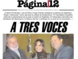En Página son los que más entusiasmo le pusieron al encuentro “A tres voces” donde “Cristina Fernández, Lula da Silva y Hugo Chávez analizaron la alianza de Argentina, Brasil y Venezuela “como eje para la unidad de Sudamérica””, agregando que “El mandatario brasileño estimuló a empresarios de su país a invertir en Argentina”, mientras que “El venezolano reivindicó las iniciativas del Gasoducto y el Banco del Sur y participó en un acto en el Conurbano”