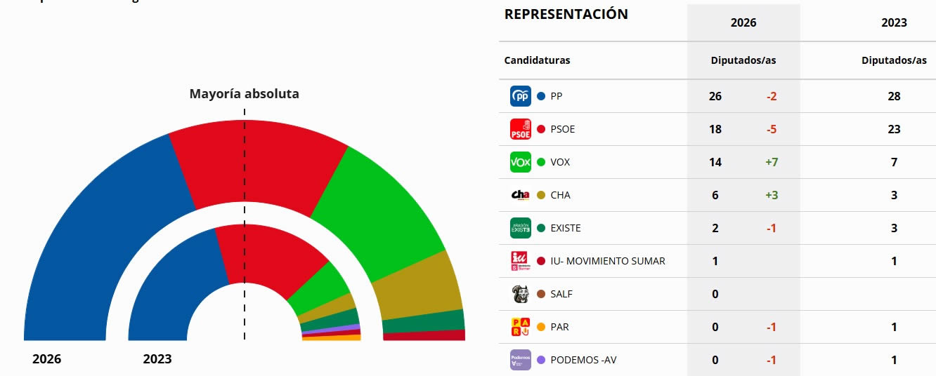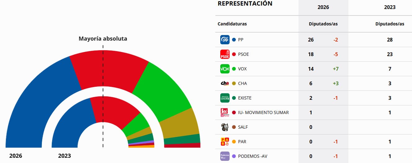 Con el 86,08% escrutado, los 'populares' obtienen 26 escaños de los 67 que tienen las Cortes de Aragón, lejos de los 34 diputados necesarios para lograr esa mayoría absoluta.