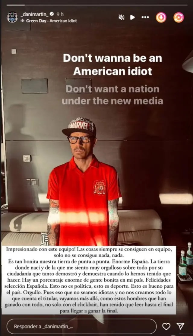 "Es tan bonita nuestra tierra de punta a punta. Enorme España. La tierra donde nací y de la que me siento muy orgulloso sobre todo por su ciudadanía que tanto demostró y demuestra cuando lo hemos tenido que hacer. Hay un porcentaje enorme de gente bonita en mi país. Felicidades selección española. Esto no es política, esto es deporte. Esto es bueno para el país. Orgullo", escribió en su stories.